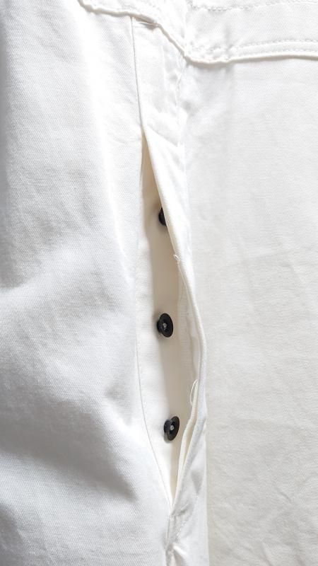 キャンバス地のようにライトでサラッとしたコットンツイルに山型ポケット、サイドシームはトリプルステッチ