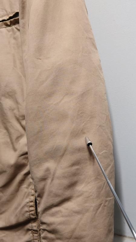 状態:左袖に小さなシミがいくつかあります、袖先に部分的なステッチ抜けやスレや小穴、若干の色褪せがあります。
