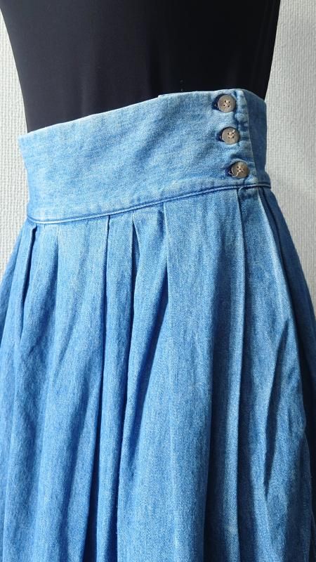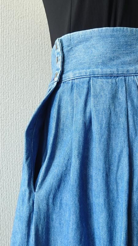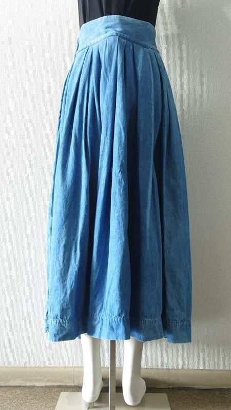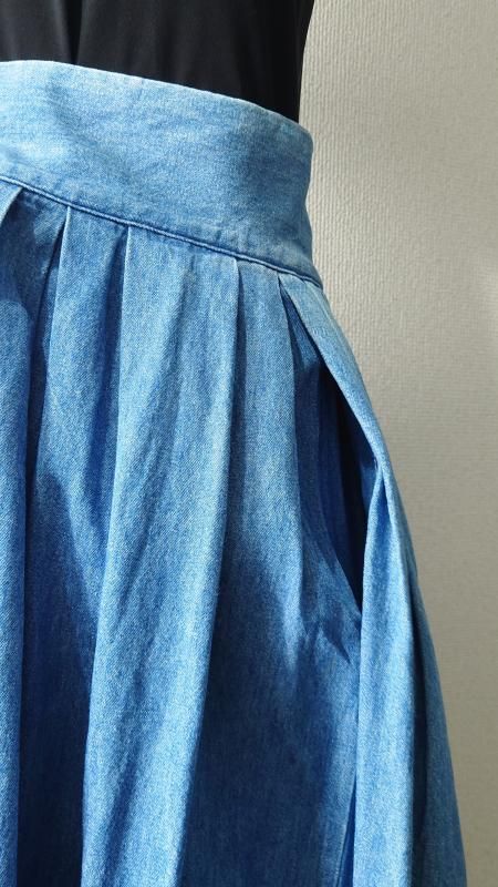 生地をたっぷり使って優雅に広がるプリーツ入りのデニムロングスカート